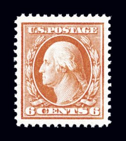 466 nh 379 image#379, 6c Red orange, a fabulously fresh and choice mint single, featuring color that is absolutely radiant and wonderfully contrasted by its brilliant white paper, perfectly centered amid extravagantly large margins, o.g., n.h., extremely fine; an eye-catching gem; photocopy of a 1995 PF certificate for a block of four, this being the top left stamp, as well as a 2006 PSE certificate (XF-Superb 95; SMQ $700.00). (Image) $80.00