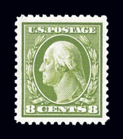 467 nh 380 image#380, 8c Olive green, magnificently centered amid extravagantly large margins, strikingly intense color and impression that would rival any proof, plus its paper is brilliantly white, pristine o.g., n.h., extremely fine gem; a fabulous quality stamp whose equal we have never before offered; 2003 and 2004 PSE certificates (the latter graded XF-Superb 95; SMQ $1,750.00). (Image) $250.00
