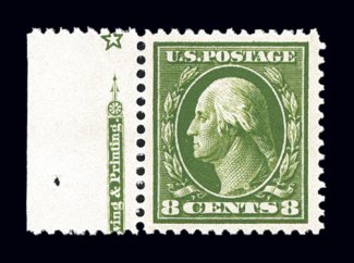 468 nh 380 var. image#380 var., 8c Dark olive green, handsome right sheet-margin partial imprint single in a distinctive Dark olive green shade (a Scott listed shade variety), possessing exceptional freshness, with incredibly intense color and a prooflike impression on brilliantly white paper, wonderfully well centered as well within unusually large margins, pristine o.g., n.h., extremely fine; 1996 PF certificate and a 2006 PSE certificate (the latter specifically identifying this as the Dark olive green shade and graded XF 90; SMQ $740.00). (Image) $250.00