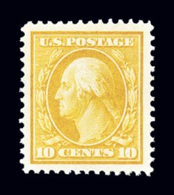 469 nh 381 image#381, 10c Yellow, an eye-arresting mint example, featuring several extraordinary physical attributes, not the least of which is its near perfect centering amid incredibly large margins, equally impressive is this stamp's absolutely radiant color which must be seen in person to fully appreciate, o.g., n.h., extremely fine gem; a truly gorgeous stamp; 1983 and 2002 PF certificates, as well as a 2006 PSE certificate (XF-Superb 95 Jumbo; SMQ $1,600.00 as 95 and $3,450.00 as 98); ex-Drucker. (Image) $240.00
