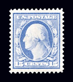 470 nh 382 image#382, 15c Pale ultramarine, an exceptional mint example of one of the most frustratingly difficult stamps of the entire Washington-Franklin Head series to find in gem quality, boasting outstanding centering amid absolutely enormous margins for this, plus this stamp also features an impressive overall freshness and crispness with strong rich color that is not the typical pale shade normally seen, unblemished o.g., n.h., extremely fine; a large-margined gem for the collector who seeks only truly exceptional quality stamps; 1992 PF certificate, as well as 1993 and 2006 PSE certificates (the latter graded XF 90; SMQ $1,700.00); ex-Weisman. (Image) $625.00