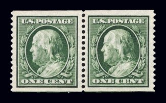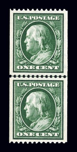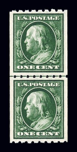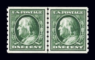 477 nh 392 image#392, 1c Green coil, perf. 8 1/2 vert., a remarkable quality guide line pair, possessing flawless centering within large margins, even its guide line is perfectly positioned between the two stamps, prooflike color and impression on brilliantly fresh paper, immaculate o.g., n.h., extremely fine gem; this elusive line pair is almost impossible to locate in such outstanding condition; 1999 PF certificate and a 2006 PSE certificate (XF-Superb 95; SMQ $1,450.00). (Image) $425.00