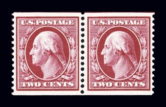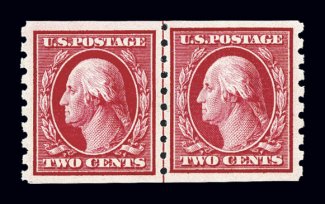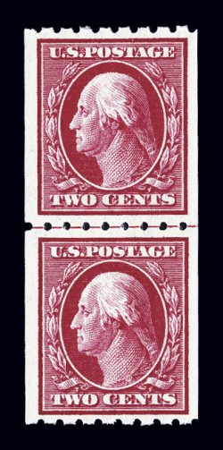 474 og 388 image#388, 2c Carmine coil, perf. 12 vert., 2mm spacing, an incredibly choice mint pair of this rare and often faked coil, possessing several exceptional physical characteristics not often encountered, including being extraordinarily well centered within considerably larger margins than usual, equally impressive is this pair's striking rich color and an incredibly detailed impression on bright fresh paper, full clean o.g., very lightly hinged, extremely fine; a rare pair in any condition, but especially so in this premium quality; 1992 PSE certificate, as well as 2003 and 2006 PF certificates (the latter graded VF-XF 90; SMQ $4,050.00). (Image) $3,250.00