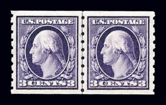 479 nh 394 image#394, 3c Deep violet coil, perf. 8 1/2 vert., a stunning guide line pair in a true "post office" state of preservation, incredibly fresh, with radiantly rich color and impression, fabulously well centered amid huge margins, o.g. (with just the slightest suggestion of a fingerprint on the reverse of the left stamp), n.h., extremely fine; a most impressive quality line pair; 1993 PF certificate for a line strip of four from which this pair was taken, as well as a 2006 PSE certificate as a line pair (XF 90; SMQ $1,800.00). (Image) $900.00