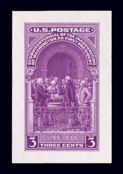 1221 P 854P2 image#854P2, 3c Washington Inauguration, small die proof on wove paper, measuring 28x43mm, excellent color on bright paper and possessing immaculate condition, extremely fine; a rare proof; A.R. Meissner, designer; John Eissler, vignette engraver. (Image) $650.00
