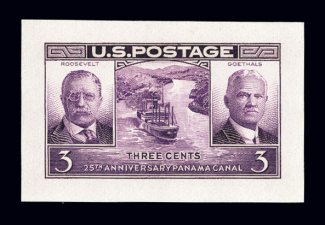 1223 P 856P2 image#856P2, 3c Panama Canal, small die proof on wove paper, measuring 43x28mm, a very pretty proof with intense color, pristine condition, extremely fine and rare; W.A. Roach, designer; W.O. Marks, vignette engraver. (Image) $600.00