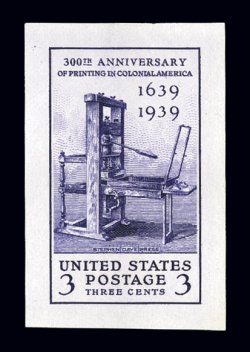 1224 P 857P2 image#857P2, 3c Printing Tercentenary, small die proof on wove paper, measuring 28x43mm, beautifully fresh on bright paper, immaculate condition and attractive, extremely fine; a rare proof; W.K. Schrage, designer; Carl T. Arlt, vignette engraver. (Image) $600.00