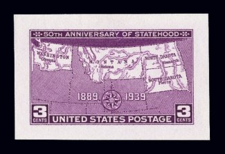 1225 P 858P2 image#858P2, 3c Fiftieth Anniversary of Statehood, small die proof on wove paper, measuring 43x28mm, very attractive, small pinhole at top of design, extremely fine appearance; a rare proof; A.R. Meissner, designer; M.D. Fenton, vignette engraver. (Image) $600.00
