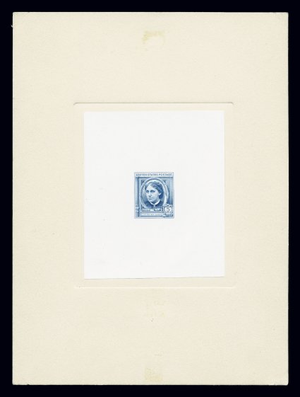1232 P 872P1 image#872P1, 5c Frances E. Willard, large die proof on India, die sunk on full size card measuring 153x203mm, exceptionally attractive on bright paper in the issued ultramarine color, Bureau handstamp on the reverse reads "Engraver's Stock Proof/Authorized by" and initialed, plus "Dec. 14, 1939" handstamp and penciled at bottom is "J. Lowe", the vignette engraver for this value, very slight wear to the corners of the card, choice very fine; an exceedingly rare proof and quite probably the only example in private hands; W.A. Roach, designer; J.R. Lowe, vignette engraver; control number 622591A (1939). (Image) $800.00