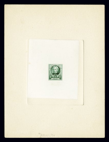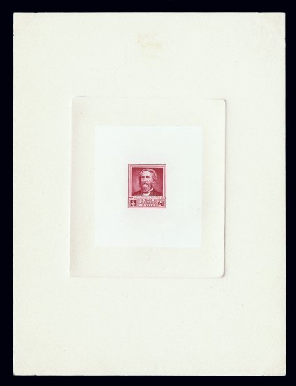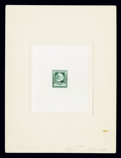 1237 P 884P1a image#884P1a, 1c Gilbert Charles Stuart, large die proof on wove paper, die sunk on full size card measuring 153x202mm, quite fresh and attractive, Bureau handstamp on the reverse reads "Engraver's Stock Proof/Authorized by" and initialed, no engraver's name is written on this card as is usually the case, but it was probably pulled for W.O. Marks, the vignette engraver for this value, exceptionally clean and extremely fine; not listed in Scott; an exceedingly rare proof and most certainly the only known example of this die proof in collectors' hands; W.A. Roach, designer; W.O. Marks, vignette engraver; control number 637914A (1940). (Image) Est. 1,000-1,500