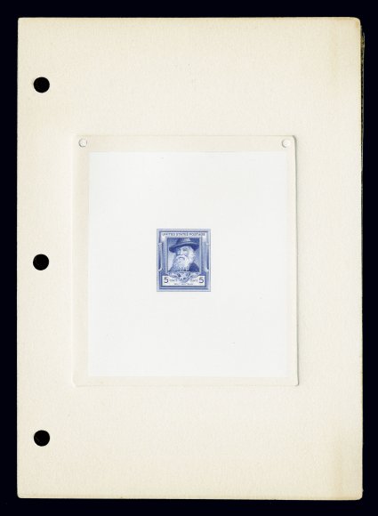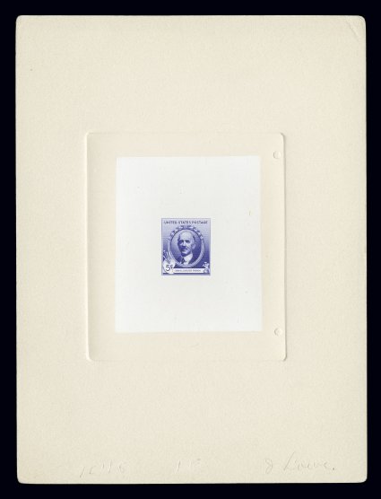 1229 P 867P1a image#867P1a, 5c Walt Whitman, large die proof on wove paper, die sunk on three-hole punched card measuring 136x190mm, a fresh and attractive proof with rich ultramarine color (for comparison with the previous 5c Alcott lot), Bureau handstamp on the reverse reading "Engraver's Stock Proof/Authorized by" and initialed, penciled at bottom is "Fenton", the vignette engraver for this value, the control number, which was apparently cut off when the card was prepared for a binder is taped to the reverse, very fine; listed in Scott on India but not priced and not listed on wove; another immensely rare proof which is quite likely the only example in private hands; W.A. Roach, designer; M.D. Fenton, vignette engraver; control number 6225311A (1939). (Image) Est. 1,000-1,500