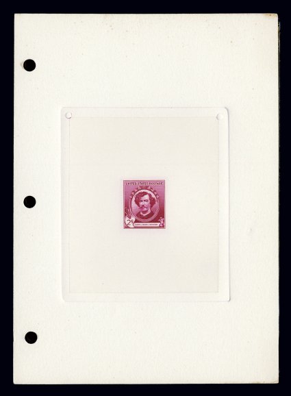 1238 P 885P1a image#885P1a, 2c James A. McNeill Whistler, large die proof on wove paper, die sunk on three-hole punched card measuring 135x190mm, a fresh and attractive proof with intense rose carmine color, Bureau handstamp on the reverse reading "Engraver's Stock Proof/Authorized by" and initialed, probably pulled for M.D. Fenton, the vignette engraver for this value, acetate overleaf taped to the reverse, very fine; unlisted in Scott; an immensely rare proof which is quite likely the only example in private hands; W.A. Roach, designer; M.D. Fenton, vignette engraver; control number 650660A (1940). (Image) Est. 1,000-1,500