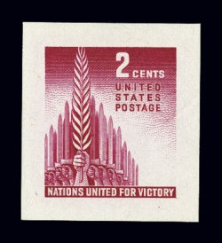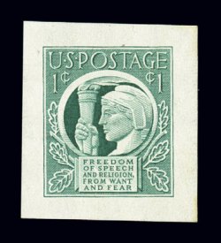 1262 P 908P2 image#908P2, 1c Four Freedoms, small die proof on bond, measuring 25x28mm, attractive proof, pinhead abrasion in left margin, choice very fine; another very rare proof; Paul Manship, designer; Carl T. Arlt, vignette engraver. (Image) $600.00
