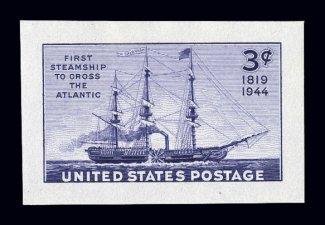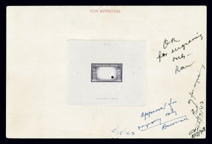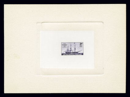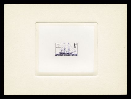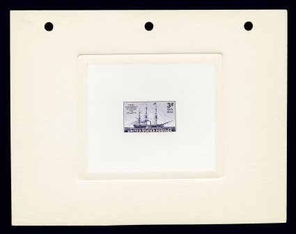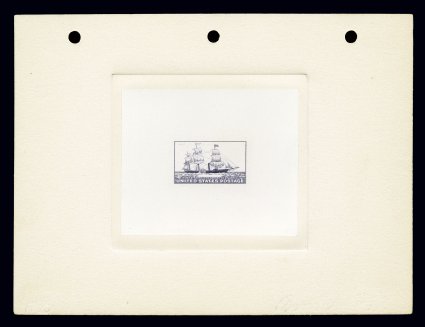 1271 E 923-E image#923-E, 3c Steamship, large die essay on wove paper, die sunk on three-hole punched full size card measuring 201x152mm, an unaccepted design showing a ship under sail and without denomination or shading in the background, from the Brooks collection, Bureau handstamp on the reverse reads "Engraver's Stock Proof/Authorized by" and initialed, with "Brooks" written in pencil at bottom having been erased from the front, exceptionally clean and fresh, very fine; the design change was probably made because this commemorative was celebrating the first steamship to cross the Atlantic and it was thought best to emphasis the ship's steam capabilities rather than its use of wind power; not listed in Scott or Brazer and certainly unique with essays of this later period being of the greatest rarity; V.S. McCloskey, designer; C.A. Brooks, vignette engraver; control number 818347A (1944); ex-Brooks. (Image) Est. 1,500-2,000