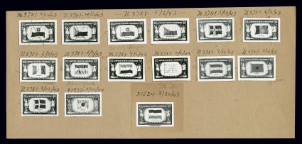 1266 P 909P1a-15P1a, 918P1a-21P1 image#909P1a-15P1a, 918P1a-21P1a, 1943-44 5c Overrun Countries, large die proofs on wove paper cplt. less only the issues for Greece and Yugoslavia, die sunk on large full size cards measuring 227x151, of the eleven proofs five of these were marked for approval, but not signed, sometimes with notes for changes to be made, these usually have time-clock handstamps on the reverse documenting the proof's movement, others with few markings except for pencil notations, one indicating "Plant proof for record", condition is quite nice, overall being quite clean and attractive, only two proofs are stapled in place by the company, very fine; unlisted in Scott; we are of the opinion that the three lots of large die proofs and essays offered here are the extent of this important large die proof material of the Overrun Countries in private hands. (Image) Est. 15,000-20,000