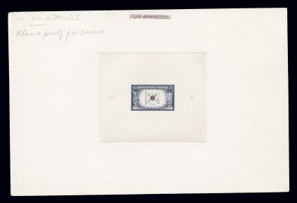 1265 P 909P1a-21P1a image#909P1a-21P1a,1943-44 5c Overrun Countries, large die proofs on wove paper cplt., die sunk on large full size cards measuring 227x151, the set of approved large die proofs, being the only approved examples of all thirteen stamps in private hands (includes two proofs of Norway, both required in conjunction for approval), the American Bank Note Co. proof paper used is a courser more fibrous wove paper than that used by the Bureau, but is different than the India paper found on the Essay in the previous lot, each proof has been approved in various ways, most usually by officials within the company, but three proofs have typical Bureau of Engraving and Printing typed approval format with Luxemburg and Netherlands being signed by Postmaster General, Frank C. Walker and Korea signed by K.P. Aldrich on September 5, 1944 while he was Acting Postmaster General, further illustration of how the American Banknote Co. was working in conjunction with the Bureau of Engraving and Printing is that Bureau control numbers are applied to the reverse of nine of the proofs, all are attractive and in quite nice condition with numerous approval notes and handstamps on front and back, because the proof paper does not adhere well to the cards, three proofs are company stapled at the top of the proof to hold it in place, we note a horizontal crease in Czechoslovakia away from the design, very fine and attractive; the history of how these came into private hands is not known having first appeared in a 1998 Cherrystone auction, but at about this period the American Bank Note Co. was divesting itself of some of the archival material in its files, (Image) Est. 20,000-30,000