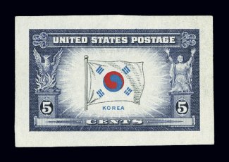 1263 E 909-21-E image#909-21-E, 1943-44 5c Overrun Countries, large die essay on India, die sunk on large full size card measuring 227x151mm, this essay consists of the completed violet engraved frame that was used for all the different issues of this series, the different nations flags and inscriptions in various colors were lithographed, inscribed at the top of the die is number "84075" and "United States of America" at bottom, this is an American Bank Note Co. approval proof, three different individuals put their manuscript approval notations on the front, as well as several receipt and approval handstamps and notes on the reverse, security punch hole in the white part of the design, this essay seems to have received a fair amount of handling in its approval rounds causing light blemishes and minor soiling to the card, the India has a couple of light corner creases well away from the design, very fine; it is quite certain that this is the only example of this engraving essay in private hands; an extraordinarily important essay of the Overrun Countries series and a must for anyone building an exhibition collection of this increasingly popular and interesting issue. (Image) Est. 3,000-4,000