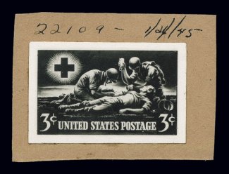 1269 E 967-E image1945 3c Red Cross, official photographic essay of the American Bank Note Co., a stamp-size photo of the artwork of a design showing Red Cross personnel aiding a soldier on the battlefield, mounted on small piece of heavy brown manila page from the company archives, with order no. "22109" and "1/26/45" date written above the photo, very fine and quite likely unique; the American Bank Note Co. printed the Overrun Country series at about the time of this essay, that series was the only set of stamps contracted out to a private company by the Bureau during WWII, it may be that this Red Cross design was proposed in conjunction with that issue and scrapped as the next Red Cross issue did not come out until 1948; a marvelous piece for the Red Cross specialist. (Image) Est. 200-300