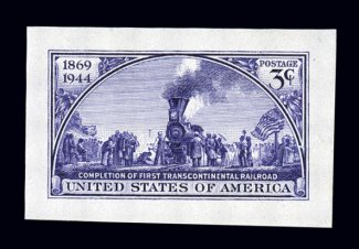 1270 P 922P2 image#922P2, 3c Transcontinental Railroad, small die proof on bond, measuring 43x28mm, lovely small die proof of this popular issue, deep color and crisp impression, extremely fine and desirable; a very rare proof; W.A. Roach, designer; Carl T. Arlt, vignette engraver. (Image) $600.00