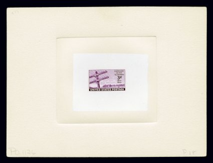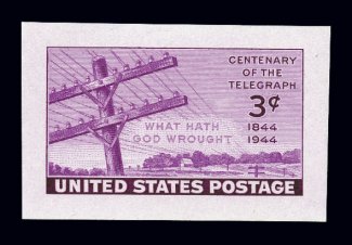 1278 P 924P1 image#924P1, 3c Telegraph, large die proof on India, die sunk on full size card measuring 201x151mm, Bureau handstamp on the reverse reads "Modeling", being from the design department rather than the more frequently seen proofs that were issued for engravers, an exceptionally clean and attractive proof being an especially strong impression, extremely fine; an extraordinarily rare proof in choice condition being quite likely the only die proof of this issue that is in public hands; V.S. McCloskey, designer; Carl T. Arlt, vignette engraver; control number 820176A (1944). (Image) $800.00
