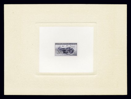 1273 P 923P1a image#923P1a, 3c Steamship, large die proof on wove paper, die sunk on nearly full size card measuring 202x147mm, from the Brooks collection, Bureau handstamp on the reverse reads "Modeling", being from the design department rather than the more frequently seen proofs that were issued for engravers, this proof also shows an unusual doubling of the die impression that we do not remember seeing before, very fresh and attractive, extremely fine; this proof is only listed by Scott on India paper and valued at $1,500.00, a figure that probably came from the sale of the Brooks collection in 1995 from which this proof was purchased, this proof and the next lot from the Brooks collection, as well as the two essays of this issue, are all on wove paper, plus these two die proofs are the only ones that we are aware of this issue; and it is quite likely that there are none on India in public hands; V.S. McCloskey, designer; C.A. Brooks, vignette engraver; control number 819133A (1944); ex-Brooks. (Image) Est. 1,000-1,500