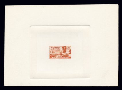 1301 P 954TC1 image#954TC1, 3c California Gold Centennial, large die trial color proof on wove paper, in reddish orange, a striking and certainly more appropriate color to celebrate gold than the issued dark violet, a beautiful trial color proof, die sunk on large card measuring 191x136mm, Bureau handstamp on the reverse reading "Engraver's Stock Proof/Authorized by" and initialed, very likely pulled for the vignette engraver, M.D. Fenton, "C" security punch taped back into place (a normal practice), acetate overleaf that was taped to the reverse has been carefully removed leaving hardly in sign of the tape, exceptionally clean and fresh, choice very fine; Scott lists neither this trial color proof nor a die proof in the issued color, very likely this is the only known example of a die proof of this issue in any color; C.R. Chickering, designer; M.D. Fenton, vignette engraver; control number 940612A (1947). (Image) Est. 1,500-2,000