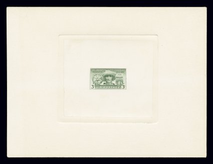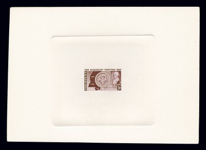 1302 TC 955P1a image#955P1a, 3c Mississippi Territory, large die proof on wove paper, die sunk on large card measuring 190x135mm, Bureau handstamp on the reverse reading "Engraver's Stock Proof/Authorized by" and initialed, plus "Fenton", the vignette engraver, penciled at the bottom, "C" security punch taped back into place (a normal practice), acetate overleaf taped to the reverse, an extraordinary clean and attractive proof, choice very fine; this value is listed by Scott on India but unpriced, it is very possible that this wove paper proof is the basis for that listing and that this is the only known example in private hands; W.T. Robinson, designer; M.D. Fenton, vignette engraver; control number 948929A (1948). (Image) Est. 1,000-1,500