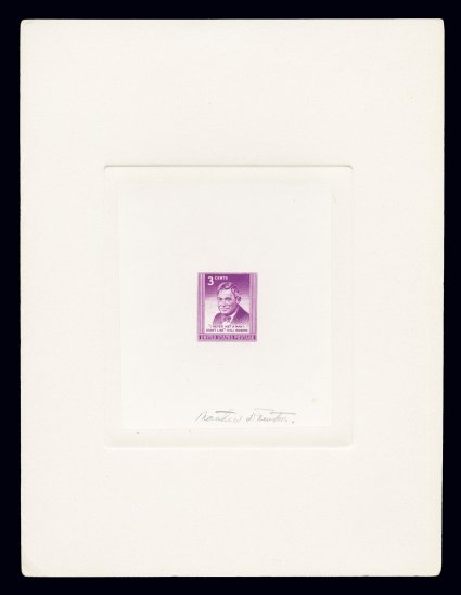 1308 P 975P1a image#975P1a, 3c Will Rogers, large die proof on wove paper, die sunk on full size card measuring 152x200mm, a handsome engraver signed proof, Bureau handstamp on the reverse reading "Engraver's Stock Proof/Authorized by" and initialed, pulled for the vignette engraver, M.D. Fenton, with his signature at the bottom of the proof paper, "C" security punch taped back into place (a normal practice), exceptionally clean and fresh, an attractive and extremely fine signed proof; listed by Scott only on India, but unpriced, however there is good evidence that this is the basis of the listing and that it may not exist on India; certainly a very rare proof that may be the only example in collectors' hands; C.R. Chickering, designer; M.D. Fenton, vignette engraver; control number 959030A (1948). (Image) Est. 1,000-1,500