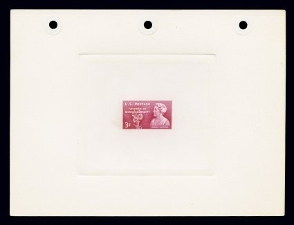 1319 P 1004P1A image#1004P1a, 3c Betsy Ross, large die proof on wove paper, die sunk on three-hole punched full size card measuring 203x154mm, a particularly attractive design in a brilliant carmine rose color, from the Brooks collection, Bureau handstamp on the reverse reading "Engraver's Stock Proof/Authorized by" and initialed, with "Brooks" written in pencil at bottom, "C" security punch taped back in place (a normal practice), a lovely die proof, choice very fine; listed by Scott only on India though this proof is quite likely the basis for the listing, certainly a very rare proof and undoubtedly the only known example of this die proof in public hands; V.S. McCloskey, designer; C.A. Brooks, vignette engraver; control number 60742B (1951); ex-Brooks. (Image) Est. 1,000-1,500
