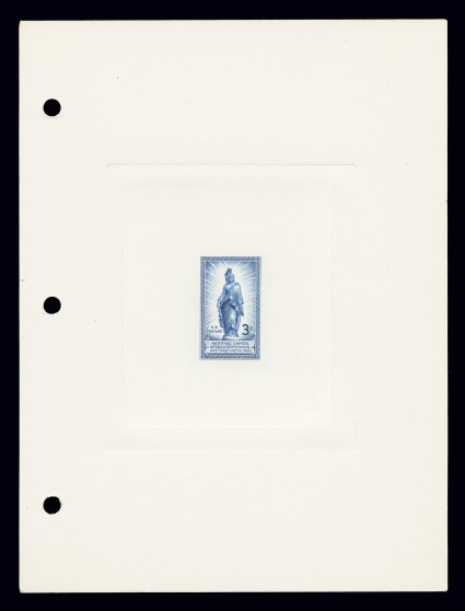 1303 P 956P1a image#956P1a, 3c Four Chaplains, large die proof on wove paper, die sunk on large card measuring 192x139mm, Bureau handstamp on the reverse reading "Engraver's Stock Proof/Authorized by" and initialed, probably pulled for M.D. Fenton, the vignette engraver, "C" security punch taped back into place (a normal practice), acetate overleaf taped to the reverse, a beautiful proof and exceptionally handsome, choice very fine; this value is listed by Scott on India but unpriced, it is very possible that this wove paper proof is the basis for that listing and that this is the only known example in private hands; C.R. Chickering, designer; M.D. Fenton, vignette engraver; control number 948653A (1948). (Image) Est. 1,000-1,500