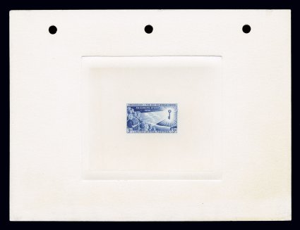 1342 P 1081P1a image#1081P1a, 3c Wheatland, large die proof on wove paper, die sunk on three-hole punched full size card measuring 203x153mm, Bureau handstamp on the reverse reading "Engraver's Stock Proof/Authorized by" and initialed, Brooks was not an engraver on this issue and there is no pencil notation as to which engraver this was pulled for, however it was included in the Brooks collection and may have been given to him by one of the engravers, "C" security punch taped back in place (a normal practice), light spot of toning affecting the top of the design, otherwise very fine; Scott only lists this on India though this proof is quite likely the basis for the listing, certainly a very rare proof and quite likely the only known example of this die proof in public hands; V.S. McCloskey, designer; R.M. Bower, vignette engraver; control number 188915B (1956); ex-Brooks. (Image) Est. 1,000-1,500