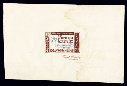 1347 E 1140-E image#1140-E, 4c Benjamin Franklin Credo, hand drawn model on tracing paper, in red, blue and white ink, drawing of an unaccepted design, not exactly as the issued design with different symbol at left and different signature of Benjamin Franklin, but overall a very similar design to what was issued, signed by Frank V. Conley, the designer of the Credo issue, slight staining in the right half of the paper and a bit of paint chipping in the top label, very fine and an incredible art model of a fairly modern issue; unlisted in Scott and certainly unique; F.V. Conley, designer. (Image) Est. 1,000-1,500
