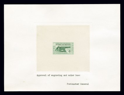 1348 P 1178P1 var. image#1178P1 var., 4c Fort Sumter, large die proof on stiff yellowish bond, a most unusual die proof, not being the usual engraver's proof, mounted on a die sunk card with typed "Approval of engraving and color hue:/Postmaster General," but not signed, on the reverse the card has some thinning from double sided tape, apparently having been mounted, there are normal color pencil notations, plus pencil "Approved Die Proof", control number is written in ballpoint pen and is appropriate for the period with handstamp "Stock" beneath it, an attractive proof of a most unusual nature, very fine; this 1961 proof is not only the latest issued stamp in the Livingston collection, but it bears the latest recorded stamp Bureau control number recorded in public hands, Scott lists this on India but this is most certainly the item referred to; undoubtedly the only die proof of this issue available to collectors; C.R. Chickering, designer; A.W. Dintaman, vignette engraver; control number 44871C (1961). (Image) Est. 1,500-2,000