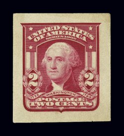 1356 P 319iP2 image#319iP2, 2c Carmine, Ty. II, small die proof on wove paper, measuring 24x27mm, neither the paper of a late issue Roosevelt proof or the Panama-Pacific issue, fresh with deep rich color, minute trivial pinholes by the top corners, which appear to have been done in the process of positioning, very fine; all the type II proofs of this value are exceptionally rare; C.A. Huston, designer; G.F.C. Smillie, vignette engraver. (Image) $1,000.00