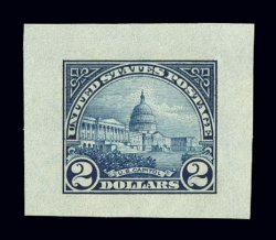 1401 P 573P1 image#573P1, $5.00 Carmine and black, large die proof on India, hybrid proof die sunk on nearly full size card measuring 147x198mm, this hybrid proof consists of an India proof mounted on a yellow bond paper in the die sunk area, this is the way all contemporaneous die proofs of this value that we have recorded come including all the approved proofs, only a couple late date proofs on wove paper, like the F.D. Roosevelt example, are apparently not hybrids, this one being an original proof of the 1922 period from the collection of John Eissler, exceptionally clean and fresh with great color, only a small minor corner bend to the card at bottom right, choice very fine; a select example of this rare high value; C.A. Huston, designer; John Eissler, vignette engraver; control number 70141; ex-Eissler. (Image) $5,000.00