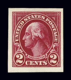 1403 P 554P3 image#554P3, 2c Carmine, plate proof on wove paper, attractive example of this scarce proof with full to extra-large margins, deep color, choice very fine; the accompanying certificate calls this a small die proof of #634(?), perhaps because of the larger margin at bottom, but clearly a plate impression, perhaps with a portion of sheet margin at bottom, not a die impression; listed in Scott but not priced; clearly a rare proof as they are almost never encountered; C.A. Huston, designer; M.W. Baldwin, vignette engraver; 1988 PF certificate. (Image) Est. 300-400