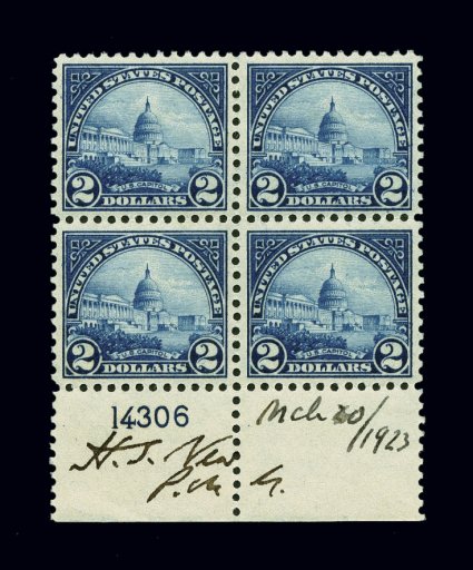 1405 ogbl 551/73, 622-23 image#551/73, 622-23, 1/2c-$5.00 1922-26 Regular issue cplt. less the 6c Red orange, but including the 13c and 17c later issued values, all in sheet margin blocks of four with plate numbers and signed by Postmasters General Hubert Work or H.S. New (50c by W. Irving Glover, Third Assistant Postmaster General), generally dated on the the first day of issue except the 1 1/2c, 17c and 50c are not dated, and the four values issued on January 15, 1923 are dated on the 17th, all are fresh with strong deep colors, well centered, o.g. lightly hinged with up to three stamps in a block n.h., the $2.00 and $5.00 each have two never hinged stamps, very fine-extremely fine. (imagea) (Image) $3,338.25+