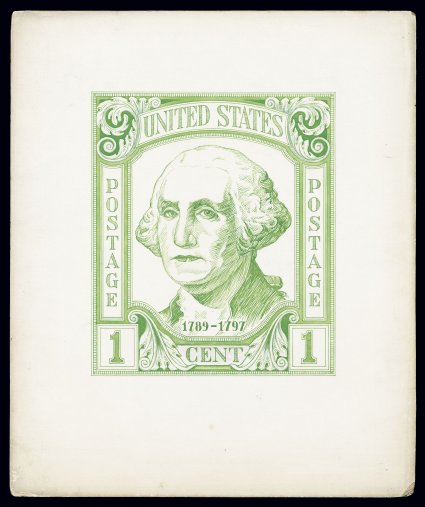1409 E 804-E image#804-E, 1c 1938 Presidential, artist's drawings for the design competition, three attractive and well done designs, in green watercolors, standard 6x7 inch designs on large artist boards measuring 253x303mm, each a different head of George Washington, similar to the vignettes of the Washington Bicentennial issue with designs taken from famous portraits, including the 2c Stuart, 6c Trumbull and 8c Saint Memin, each has a radically different frame ranging from traditional to quite modern, all seem to have been done by the same unknown artist, who was actually quite good, much better we think than the Thos. F. Morris designs that Brazer used to illustrate designs for this competition, very fine; each is unique by their very nature and though many participated in the competition rarely are these seen, especially in this high quality. (Image) Est. 1,000-1,500