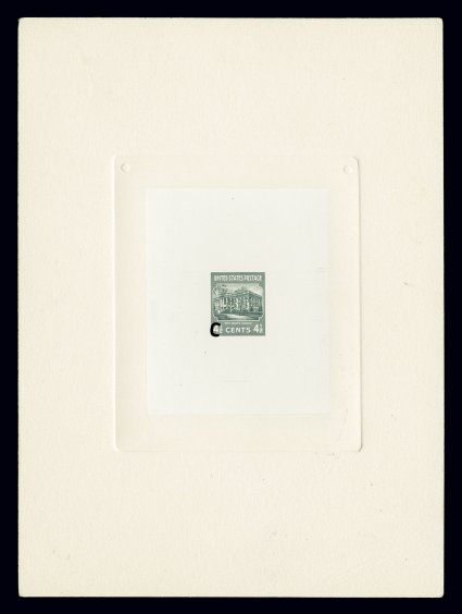 1411 P 809P1a image#809P1a, 4 1/2c Dark grey, large die proof on wove paper, die sunk on full size card measuring 150x201mm, Bureau handstamp on the reverse reads "Engravers Stock Proof/Authorized by" and initialed, with "Lowe", the vignette engraver, in pencil at bottom, "C" punch around the left "4 1/2" denomination, an exceptionally clean and attractive proof with only a slight corner bend to the card at bottom right, choice very fine; this is only listed in Scott as on India, however very few 1938 Presidential issues are known in large die proofs, it is our opinion that this is the listing example and that it is the only large die proof of this value in public hands; W.K. Schrage, designer; James R. Lowe, vignette engraver; control number 722660A (1942). (Image) Est. 1,500-2,000