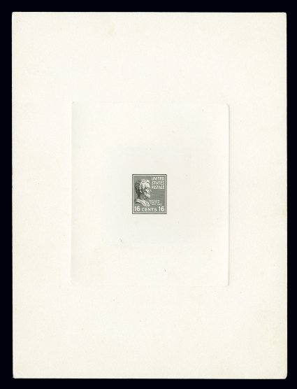 1418 P 821P1 image#821P1, 16c Black, large die proof on India, die sunk on full size card measuring 153x204mm, a lovely die proof with exceptionally clean and well preserved card, Bureau handstamp on the reverse reads "Engraver's Stock Proof/Authorized by" and initialed, penciled at the bottom is "Arlt", the vignette engraver for this value, extremely fine and one of the few proofs that came out of the Bureau through this engraver, an exceedingly rare proof, and there is reason to believe that this is the listing example which last sold for about the current catalog price in 1988; most probably the only example in private hands; W.K. Schrage, designer; Carl T. Arlt, vignette engraver; control number 566946 (1938). (Image) $1,500.00
