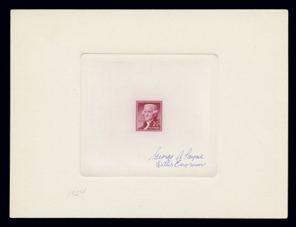 1422 P 1033P1a image#1033P1a, 2c Carmine rose, large die proof on wove paper, die sunk on full size card measuring 202x151mm, a beautiful engraver signed proof, Bureau handstamp on the reverse reading "Engraver's Stock Proof/Authorized by" and initialed, pulled for the letter engraver, George A. Payne, with his name written on the reverse and signed by him at the bottom of the proof paper, "C" security punch taped back into place (a normal practice), exceptionally clean with intense radiant color, extremely fine in every regard; this letter and frame engraver was not a prominent engraver on philatelic dies, but he often signs his proof and gives us some of the very few signed die proofs; Scott lists this proof on both India and wove with neither priced, regardless of whether there are one or two proofs of this value, they are probably all on wove; an extremely rare signed proof, which are seldom encountered; C.R. Chickering, designer; C.A. Brooks, vignette engraver; control number 147079B (1954). (Image) Est. 1,500-2,000