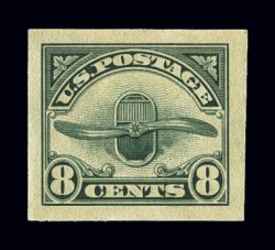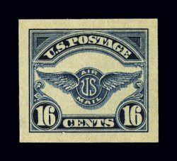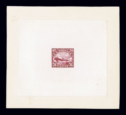 1427 P C4P1-6P1 image#C4P1-6P1, 8c-24c 1923 Air Posts, large die proofs on India cplt. except for the 8c which is on wove paper, a beautifully approval set, die sunk on full size cards measuring approximately 201x151mm, both cards and proofs are fresh and clean, typed approval dates and signed by Postmaster General Harry S. New, luxuriant fresh colors, extremely fine; the reason for the difference in paper on the 8c value is that Harry New presented sets of proofs of this period, including the 1922-25 Regular issue, to various people in 1928-29 before he left office, for the most part he used proofs in the files of the Bureau, but if enough proofs were not available for his projects, he ordered additional values or sets pulled, by this time the Bureau was using wove paper instead of India, because they visually were very similar, they were often combined indiscriminately, as far back as our records show these three proofs have always been together, a lovely and popular set of this air mail issue; C.A. Huston, designer; H. Dawson, E.M. Hall & J. Eissler, vignette engravers; control numbers in order of denomination 154047 (1929), 1233085, 1233348 (1923). (Image) $14,250.00