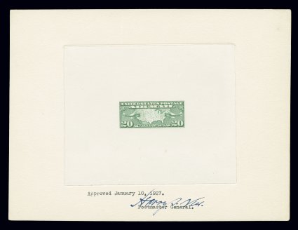 1432 P C7P1-9P1 image#C7P1-9P1, 10c-20c Maps, large die proofs on wove paper cplt., die sunk on full size cards measuring approximately 202x152mm, a lovely approval set, both cards and proofs are fresh and clean, typed approval dates and signed by Postmaster General Harry S. New, all possessing bright colors and detailed impressions, extremely fine; noteworthy is that the wove proof paper covers the entire die sinkage area which is an unusually large, particularly on the 15c; it is our opinion that at this period all of the large die proofs of this series are on wove paper even though they frequently are described as India, a lovely and rare set of this popular air mail issue; C.A. Huston, designer; L.S. Schofield, vignette engraver; control numbers in order of denomination 1369980, 5787 (1926), 31553 (1927). (Image) $9,000.00