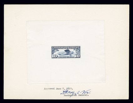 1434 P C10P1 image#C10P1,10c Lindbergh, large die proof on wove paper, die sunk on full size card measuring 202x152mm, this being from the set presented to President Calvin Coolidge, an extraordinarily choice and attractive approved proof with typed date June 7,1927 and signed by Harry S. New, Postmaster General, in excellent condition, extremely fine; Harry New presented to President Coolidge a set of die proofs for all the stamps that were issued during the Harding-Coolidge presidencies; a rare proof that quite likely only exists on wove paper and is especially rare in this superlative condition; C.H. Hall & A.R. Meissner, designers; John Eissler, vignette engraver; control number 66866 (1927); ex-Coolidge. (Image) $6,000.00