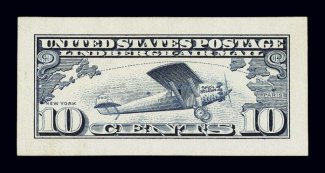 1435 P C10P2 image#C10P2, 10c Lindbergh, small die proof on wove paper, a pristine proof, possessing bright color on white paper, plus wide even margins, measuring 63x25mm, lovely immaculate condition, extremely fine; a very rare proof that is considerably rarer than the large die proofs; C.H. Hall & A.R. Meissner, designers; John Eissler, vignette engraver. (Image) $6,000.00