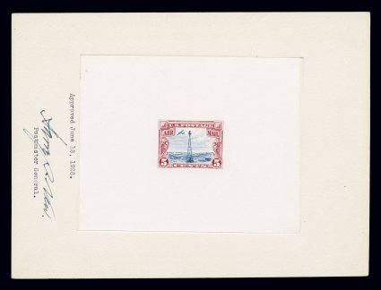 1436 P C11P1 image#C11P1, 5c Carmine and blue, large die proof on wove paper, an absolutely pristine approved large die proof, die sunk on full size card measuring 204x152mm, dated June 18, 1928 and signed by Harry S. New, Postmaster General, this lovely proof possesses remarkable freshness with brilliant colors, extremely fine in all respects; a rare large die proof that is doubtful it could be improved upon; A.R. Miessner, designer; A.S. Schofield, vignette engraver; control numbers 123474, 123475 (1928). (Image) $6,000.00