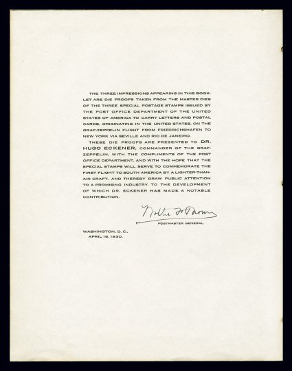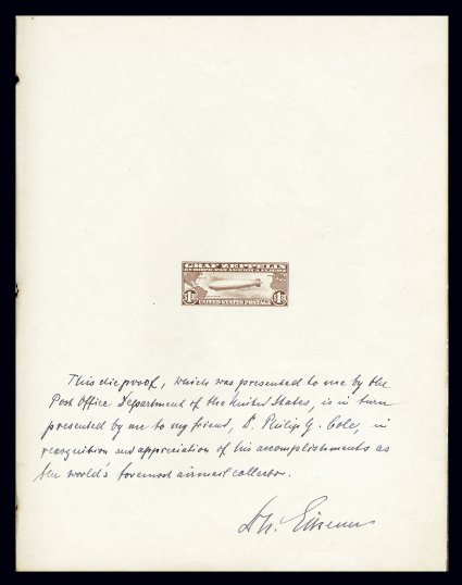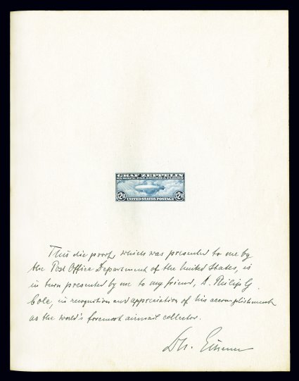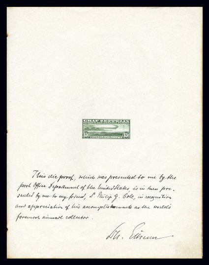 1437 P C13P1-15P1 var. image#C13P1-15P1 var., 65c-$2.60 Graf Zeppelins, large die proofs on bond cplt., the spectacular and unique set presented to Dr. Hugo Eckener, Commander of the "Graf" Zeppelin, a specially prepared presentation book, string bound in a full padded leather folder, the format is totally unlike any other set of large die proofs consisting of two sheets folded in the center for binding to produce four two-sided pages, each page measuring 191x245mm, if disassembled one leaf would show a printed presentation page dated "Washington, D.C., April 16, 1930" and signed by Walter F. Brown, Postmaster General, on the facing page is the die proof of the $2.60 Blue, the other leaf has the die proof of the 65c Green proof on one page and the $1.30 proof on the reverse of the other side of the leaf, assembled the presentation page starts on the left side facing the 65c on the right, and the $1.30 and $2.65 proofs are on the following right side pages, the paper is a light cream bond, the proof images are centered within each page, not being die sunk, nor were any control numbers applied, the book has been preserved in excellent condition with only a tiny mended tear to the bottom of the presentation page, the barest trace of edge toning is present, being unavoidable because of the spider web glassine interleaving pages, very fine with both the proofs and the book in its totality being magnificent.The "Graf" Zeppelin made its first flight to the United States in the fall of 1928. In 1929 it made an historic Round-the-World flight crossing the United States, stopping at Los Angeles and Lakehurst. When a Pan-American flight was planned in 1930 the United States, as gesture of goodwill towards Germany, decided to issue the first set of Zeppelin air mail stamps. During the course of this flight, when the Zeppelin was in Lakehurst, the Post Office Department presented this set of die proofs to Dr. Hugo Eckener, the Commander of the airship. Second Assistant Postmaster General, Irving W. Glover, made the presentation to Dr. Eckener before a huge crowd of spectators. It was immediately recognized that the proofs were of considerable value to collectors and apparently it was only a short time later when this book was transferred in ownership to Dr. Phillip G. Cole. In presenting it to Dr. Cole, Dr. Eckener inscribed and signed in his own hand at the bottom of each proof, "This die proof, which was presented to me by the Post Office Department of the United States, is in turn presented by me to my friend, Dr. Philip G. Cole, in recognition and appreciation of his accomplishments as the world's foremost airmail collector."This book, and the proofs that are in it, are unique in so may ways. The large die proofs are totally unlike any die proof issued by the Bureau of Engraving and Printing. The paper on which they were pulled, the way in which they were printed, and the format in which they are made are entirely unique from all other die proofs and from the three or four sets of large die proofs that are known of the Graf Zeppelin issue. But historically they are also of extraordinary significance, relating not just to this popular issue of stamps but to the whole area of aero philately that was ushered in by these huge and fascinating airships of Germany. This presentation book has been the centerpiece of many important collections. For the Zeppelin collector, the air post collector or the proof collector, this Eckener set of the 1930 Graf Zeppelin large die proofs is undoubtedly the most important twentieth century proof set of the United States. C.A. Hall & A.R. Meissner, designers; J.C. Benzing, vignette engraver; ex-Cole, Harris and Dale. (imagea) (imageb) (imagec) (Image) Est. 40,000-50,000