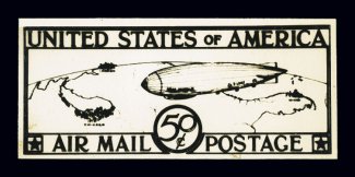 1440 E C25-31-E image#C25-31-E, 6c-50c Transports, large master die essay on wove paper in black, the completed die as issued without denomination, die sunk on full size card measuring 201x150mm, Bureau handstamp on the reverse reads "Engravers Stock Proof/Authorized by" and initialed, with "Lowe", the vignette engraver, penciled at bottom, "C" punch on the space where the denomination would eventually go, exceptionally clean and attractive, extremely fine; unlisted in Scott, in fact the only essays of air post stamps are for the #C3; this immensely important air mail essay shows the process by which they developed a design that would be used for several values, this has been made available to collectors because it was an engraver's proof given to J.R. Lowe, a vignette engraver, who was responsible for several other important and rare proofs and essays, undoubtedly the only essay of its kind in public hands; W.A. Roach, designer; J.R. Lowe, vignette engraver; control number 722657A (1942). (Image) Est. 7,500-10,000