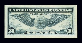 1439 P C24P2 image#C24P2, 30c Dull blue, small die proof on wove paper, measuring 51x24mm, bright color on white paper, faint thinning, extremely fine appearance and handsome, an extraordinarily rare proof of which only two or three are known; A.R. Miessner, designer; F. Pauling, vignette engraver. (Image) $2,750.00