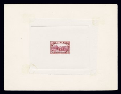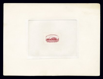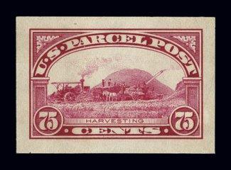 1481 E Q11-E var. image#Q11-E var. 75c Harvesting vignette, large die essay on India, in issued carmine, die sunk on full size card measuring 202x152 with untrimmed India around the die area, the adopted vignette for this value with a square of the India cut away removing the frame and leaving just the vignette, card is quite fresh and attractive with just a faint band of toning at top, choice very fine; this proof was undoubtedly pulled for vignette engraver, C.M. Chalmers, producing a most unusual essay very similar to the listed #567-E2 and 568-E2 essays (see lots 1391-1392 and for similar 5c Parcel Post see lot 1476), Gary Griffith speculated that the vignette engraver, Charles Chalmers, was given proofs of stamps that he had engraved and that the frames were removed so that he could show examples of his vignette engraving, this is the only example of this essay that we are aware; C.A. Huston, designer; C.M. Chalmers, vignette engraver; control number 561001 (1912); ex-Doolittle, Bothamley. (Image) Est. 2,000-3,000